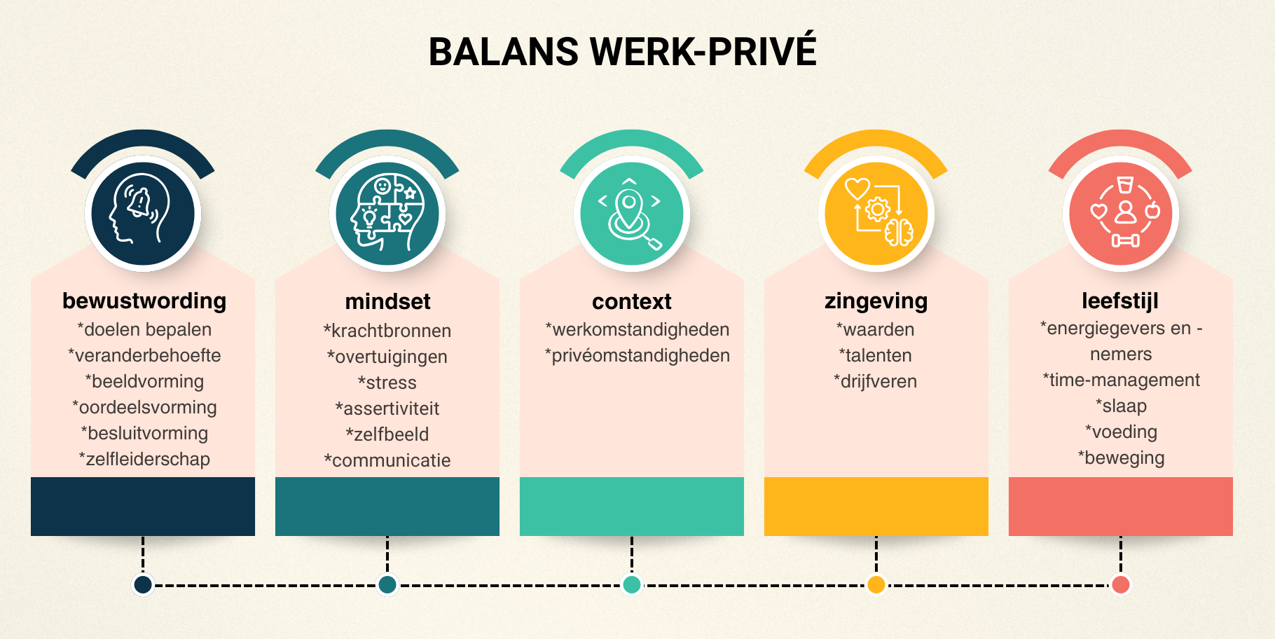 Een coachingstraject balans werk-privé kan uit de volgende onderdelen bestaan: